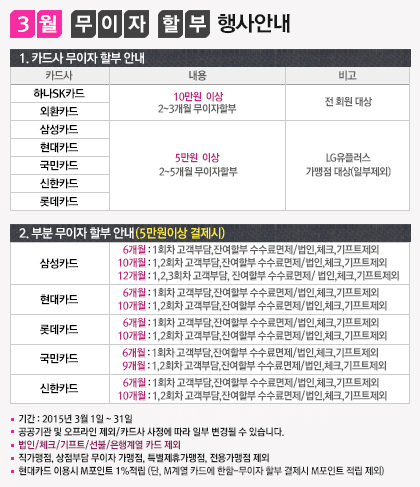 | 이전글 ▼ | 2015년 2월 무이자 할부 행사안내 | 관리자 | 2015-02-23 | 10181 |