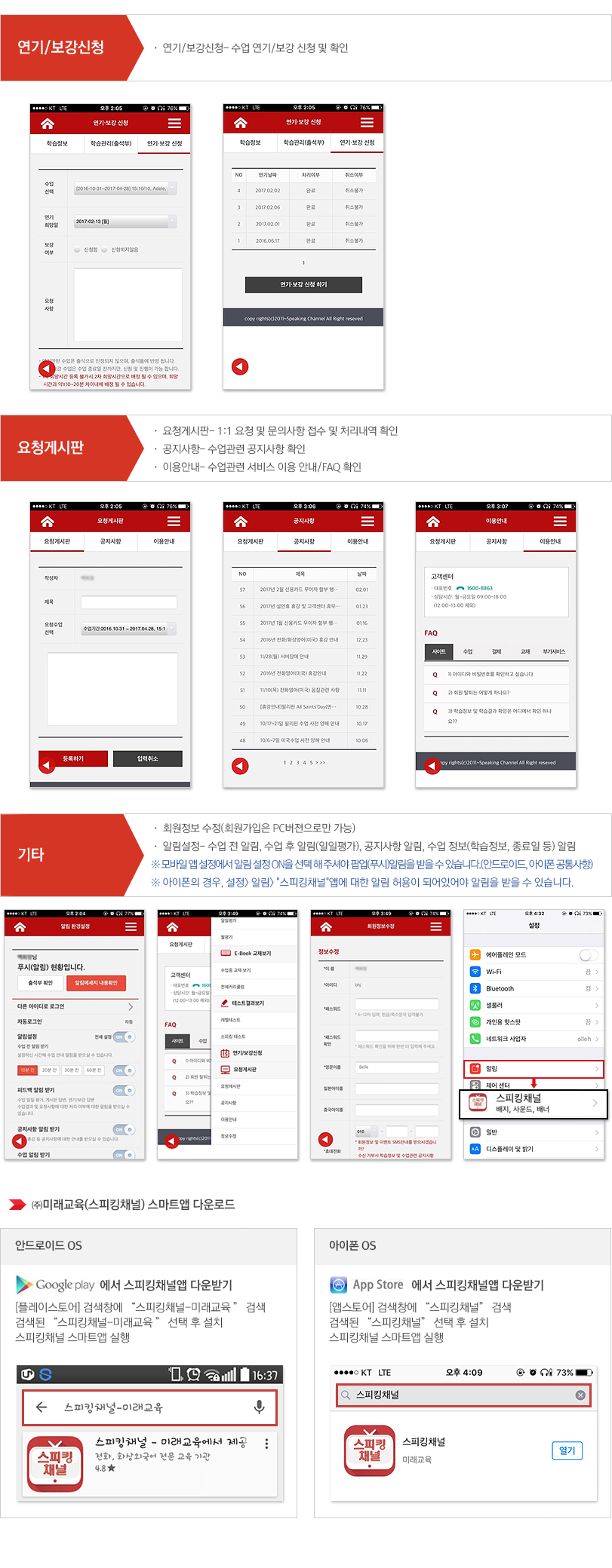 모바일 앱 출시 되었습니다. 관련하여 기존에 제공된 수업 전, SMS발신은 2/28일까지만 서비스 지원이 되며, 이후 모바일 앱 알림으로 서비스 이용이 대체됨으로 각 학습자 여러분은 사용하시는 모바일 기기에 따라 앱 설치 및 이용하여 주실 수 있도록 하여주세요.